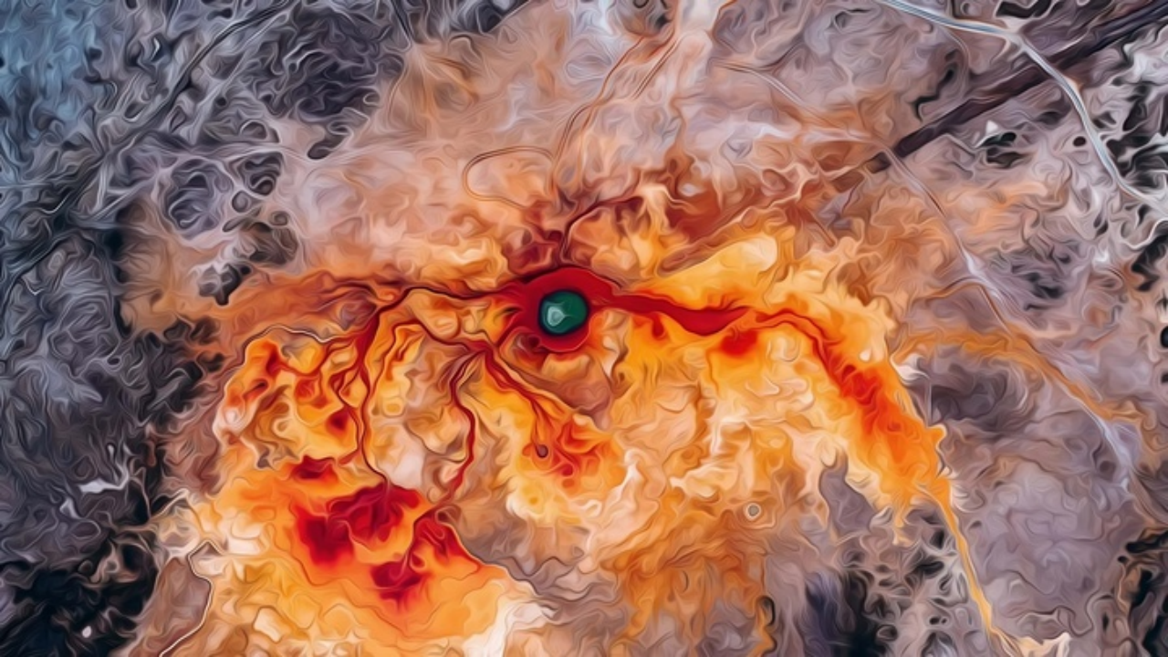 恶魔之眼——艾肯泉,泉眼与喷涌出的泉水以及周围土地上深红色环带状的沉淀物,组成了一个奇特的瞳孔造型,仿佛一只镶嵌在大地上的眼睛,被称为“恶魔之眼”。它位于雪山脚下广袤的大地上,视野开阔,泉眼周围由于长年硫磺沉淀形成了多样优美的图画,大自然的鬼斧神工令人叹为观止。